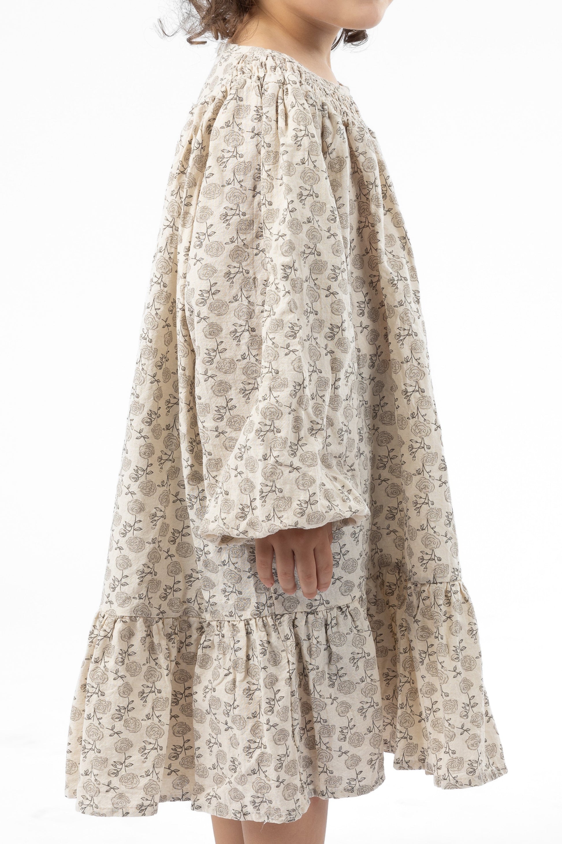 Ses manches bouffantes, légèrement resserrées par un élastique, donnent du volume et de la légèreté, tandis que le bas de la robe est sublimé par un volant froncé qui crée un joli mouvement à chaque pas.