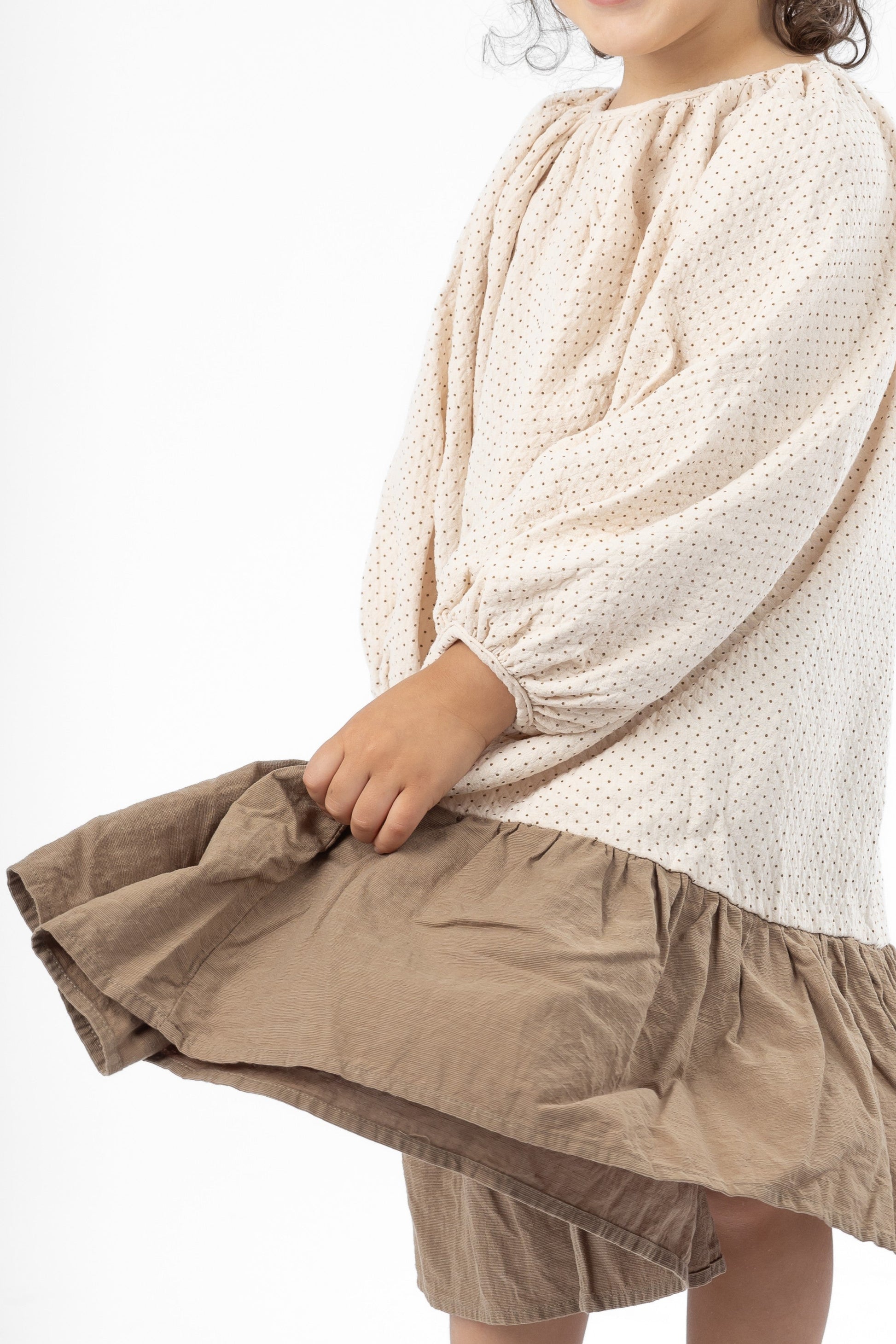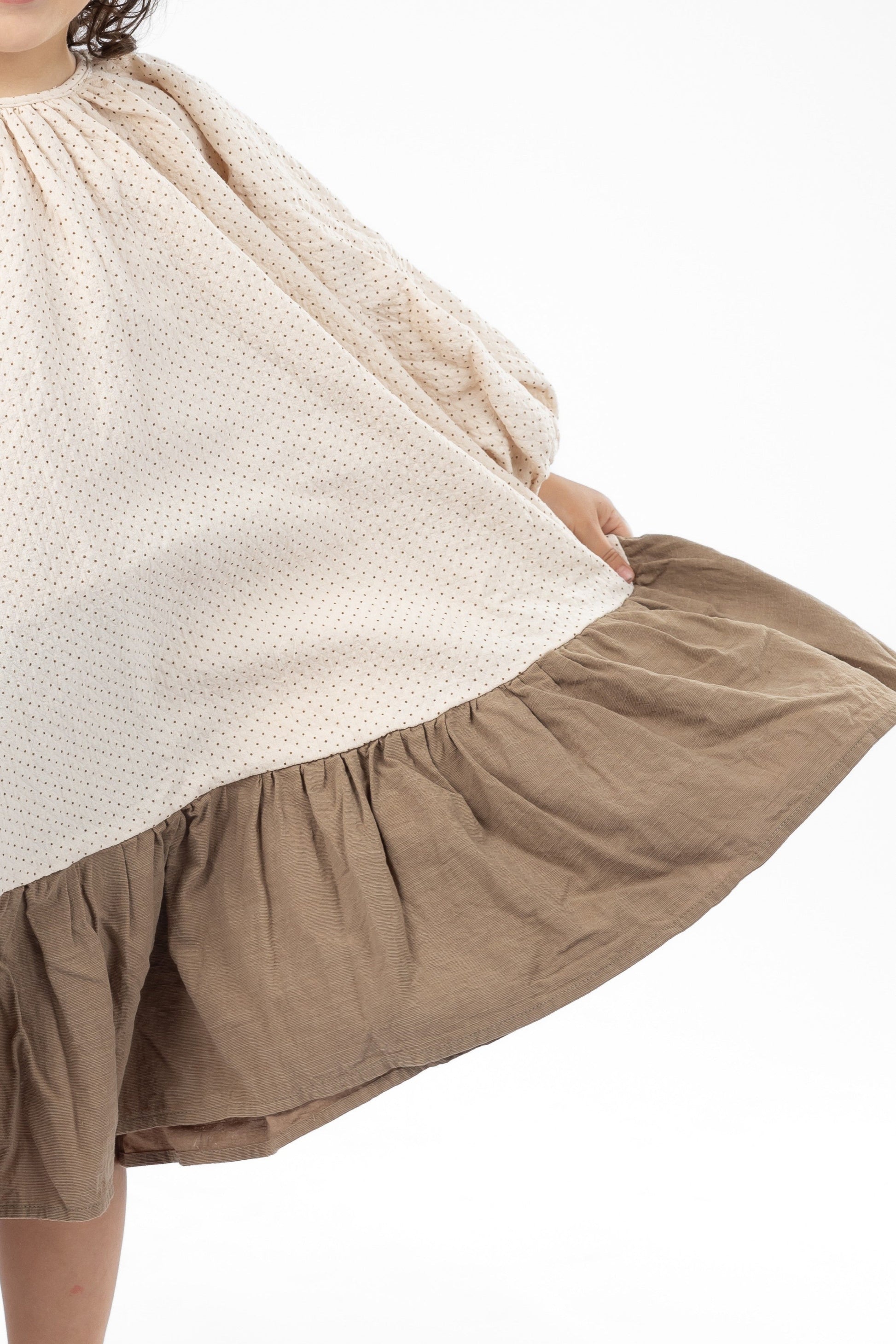 Les manches longues resserrées par un élastique ajoutent du volume et de la légèreté, tandis que l’encolure froncée apporte une touche délicate et poétique. Une robe parfaite pour une allure décontractée chic, inspirée du vestiaire coréen et japonais.